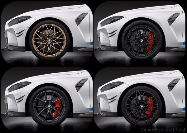 At the time of market launch, the range of M Performance Parts for the new BMW M3 Sedan and the new BMW M4 Coupé comprises two complete sets of summer wheels. Entry level is the M Performance Y-spoke forged wheel 963M in Frozen Gunmetal Grey with M Performance lettering and mixed tyres, 19 inches at the front and 20 inches at the rear. It convinces with its unique geometry and guarantees a high degree of stiffness and low weight as well as reduced air resistance particularly at high speeds. Highlight of the wheel range for the summer is the BMW M Performance cross-spoke forged wheel 1000M in Gold Bronze matt or Jet-Black matt with M Performance lettering. The wheels are available exclusively from M Performance Parts in the sizes 20 inch at the front and 21 inch at the rear.