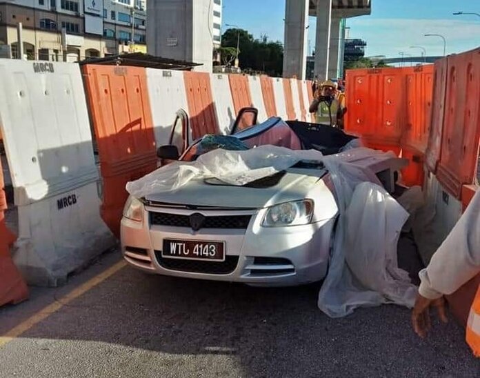 A woman miraculously escaped death after the car she was driving was hit by a falling slab of concrete. The incident, which could have easily taken a turn for the worse, took place along the MRR2 near Terminal Bersepadu Selatan (TBS) at around 4.30 pm today (September 19).