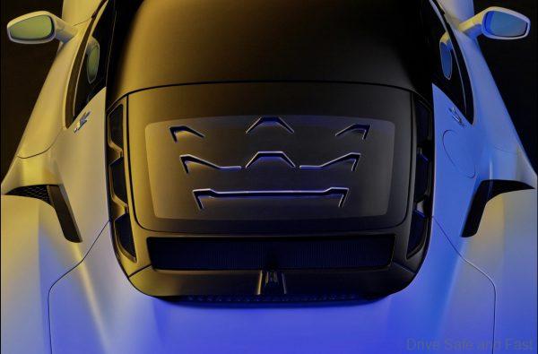 The car’s exterior is designed serve performance, with butterfly doors and extreme aerodynamic solutions. It’s also pretty minimal inside, save for the two 10” screens. Carbon-fibre is a key feature of the interior and there are some creature comforts here such as a wireless smartphone charger, power windows and more.