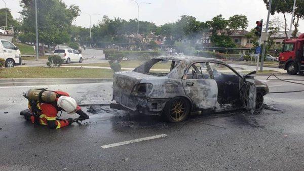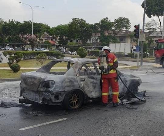 It looks as if the incident took place near the Taipan Business District in USJ. The blue Imprezza had a fire develop in the engine bay. It seems the police were able to get the traffic situation under control relatively quickly (there’s a police station a short way down the road). However, the firemen were unable to get to the car on time and as a result, nothing but a smoldering shell of the car and its rims were left.