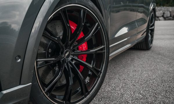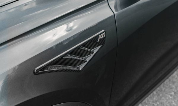 Attractive alloy wheels are essential in creating a vehicle’s coherent aesthetic. The 23-inch ABT High Performance GR in “glossy black” looks breathtaking, even on the massive SUV coupé. The strongly concave base and the diamond machined rim flange contribute to the unique design. All ABT Sportsline high-performance wheels feature one-piece manufacturing and are up to 40% lighter than conventional cast wheels. Modern flowforming technology is used for creating the High Performance GR: Parts of the cast rim base are rolled out and compressed as part of an additional production stage. This allows the rim bed volume to be reduced by up to 50 percent. This facilitates thinner wall thicknesses and thus a slim design with extreme stability. Furthermore, ABT Sportsline offers a sporty finishing touch: A rear spoiler and fender inserts made of carbon fibre, which visually emphasise the dynamic performance of the vehicle perfectly.