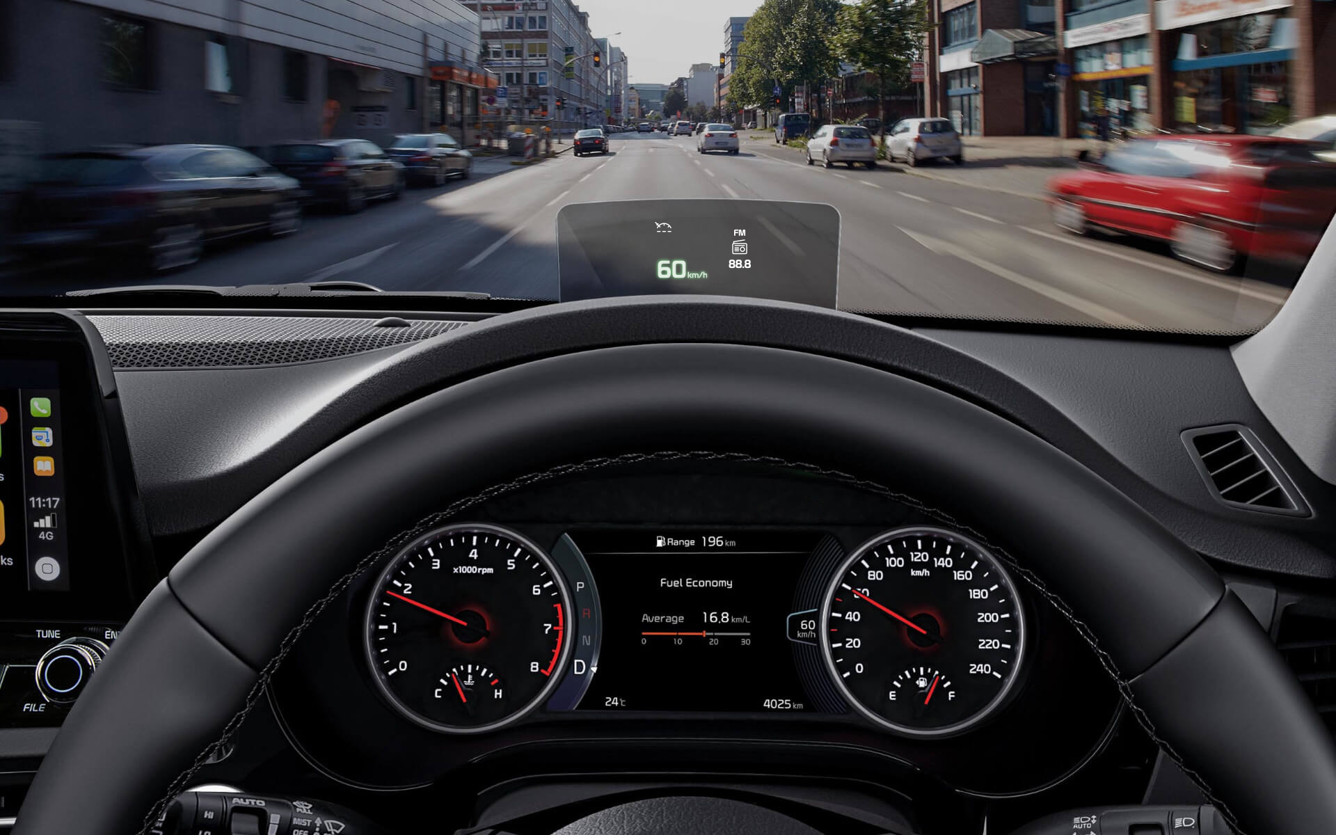 To further enhance driving experience, the vehicle features the Head Up Display (HUD) to assist safe driving by minimizing movement of the driver’s line of sight. The head-up screen displays the vehicle’s speed, as well as the Auto Cruise Control and radio stations or song list so drivers can otherwise focus their attention on driving.