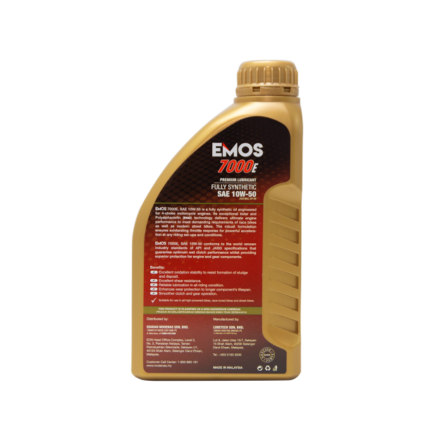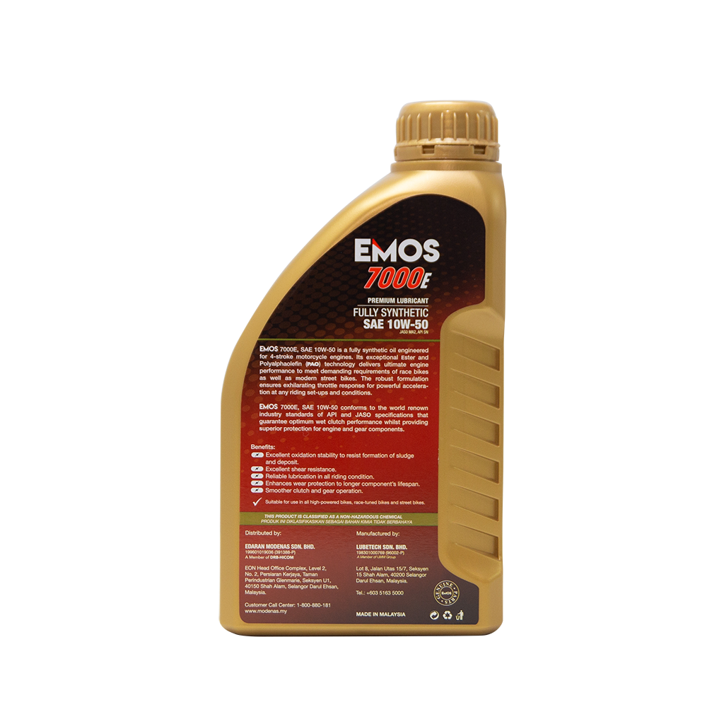 The PAO and ester are ingredients that allow for consistent engine performance and protect vital engine components in all sorts of riding modes and conditions. The lubricants meet the standards of American Petroleum Institute (API) and Japan Automotive Standards Organisation (JASO). The fully synthetic EMOS 7000E surpasses the international standards of American Petroleum Institute API SN and JASO MA2, with the use of cutting-edge technology and innovative formulation.