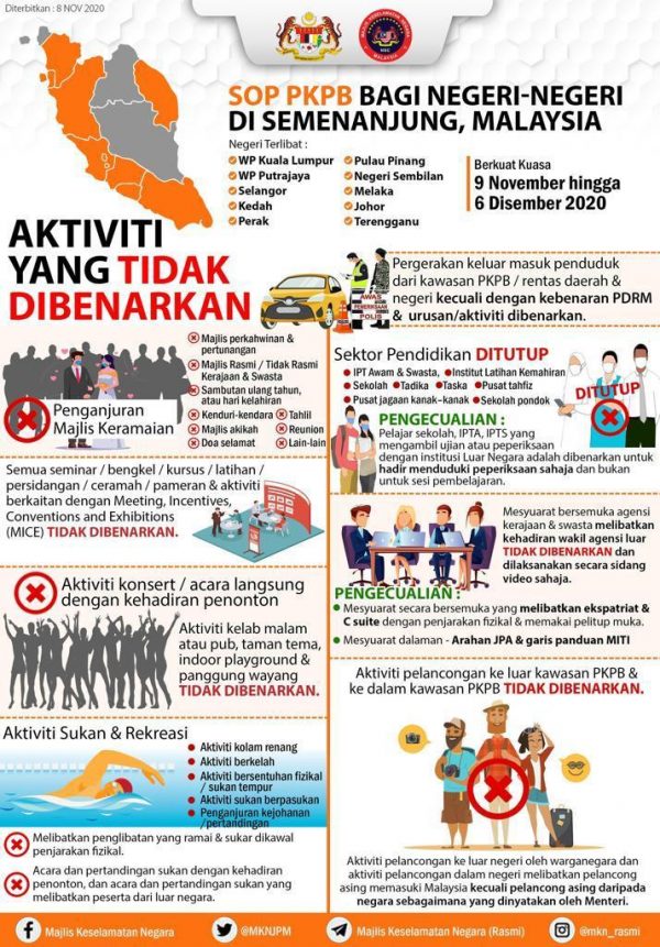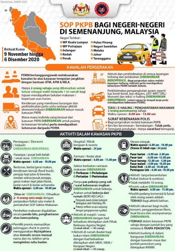 - Any individuals who are outside the CMCO areas are allowed to return home with PDRM’s permission.