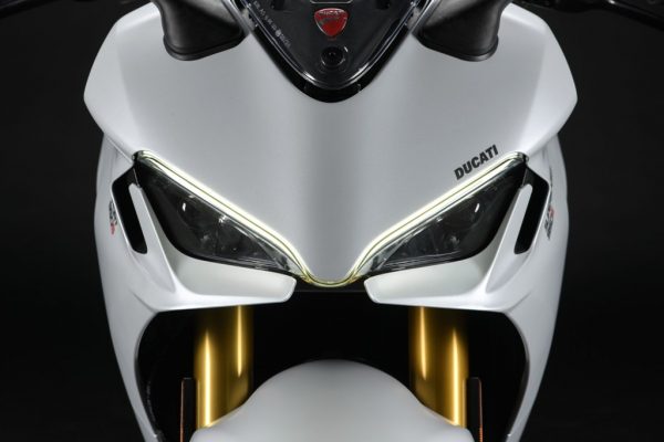 The aesthetic link between SuperSport 950 and Panigale V4 is now even stronger. The front view is defined by the new full-LED headlight supported by two fins and flanked by two air intakes that widen the view. The DRL clearly recalls the sharp luminous signature of the Panigale V4 and is made thanks to a refined opal that diffuses the light evenly.