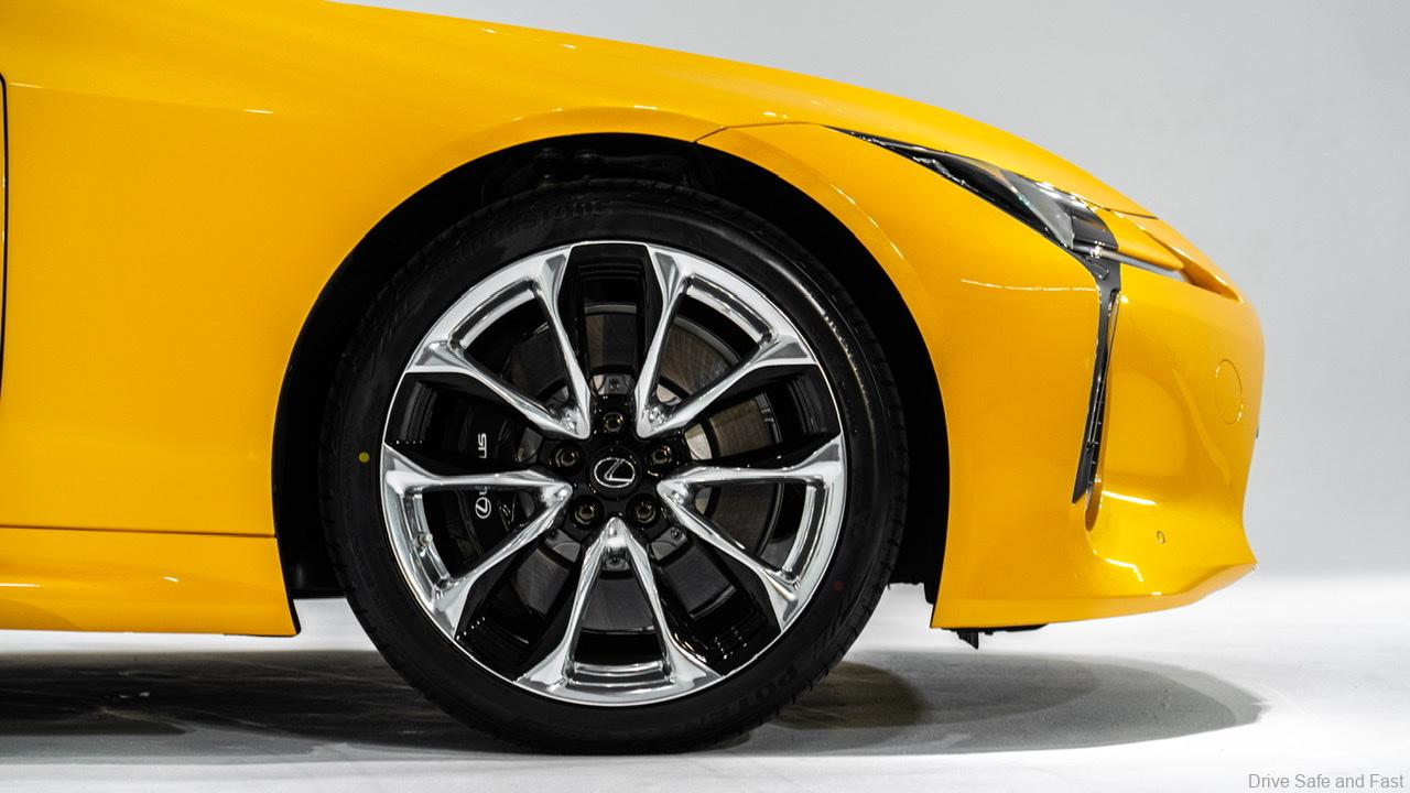 The LC 500 Convertible comes with large-diameter 21-inch forged wheels with two-tone polished finish and black coating. Run-flat tires are employed at all four corners to eliminate the need for a spare tire, which, in turn, allows engineers to shorten the rear overhang and save additional weight by foregoing a spare.