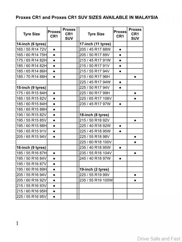 The Proxes CR1 passenger car tyre is available in 36 sizes (14”-18” rim diameters). Prices range from RM160-RM440.