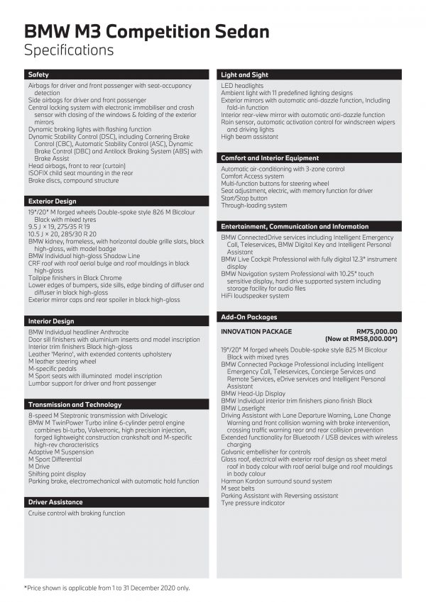 Pricing for the all-new M3 Competition starts from RM664,800 and ticking the Innovation Package box will cost customers an additional RM75,000. However, the package is offered at a discounted price of RM58,000 until 31 December 2020. Those interested will need to pay RM5,000 to place a booking.