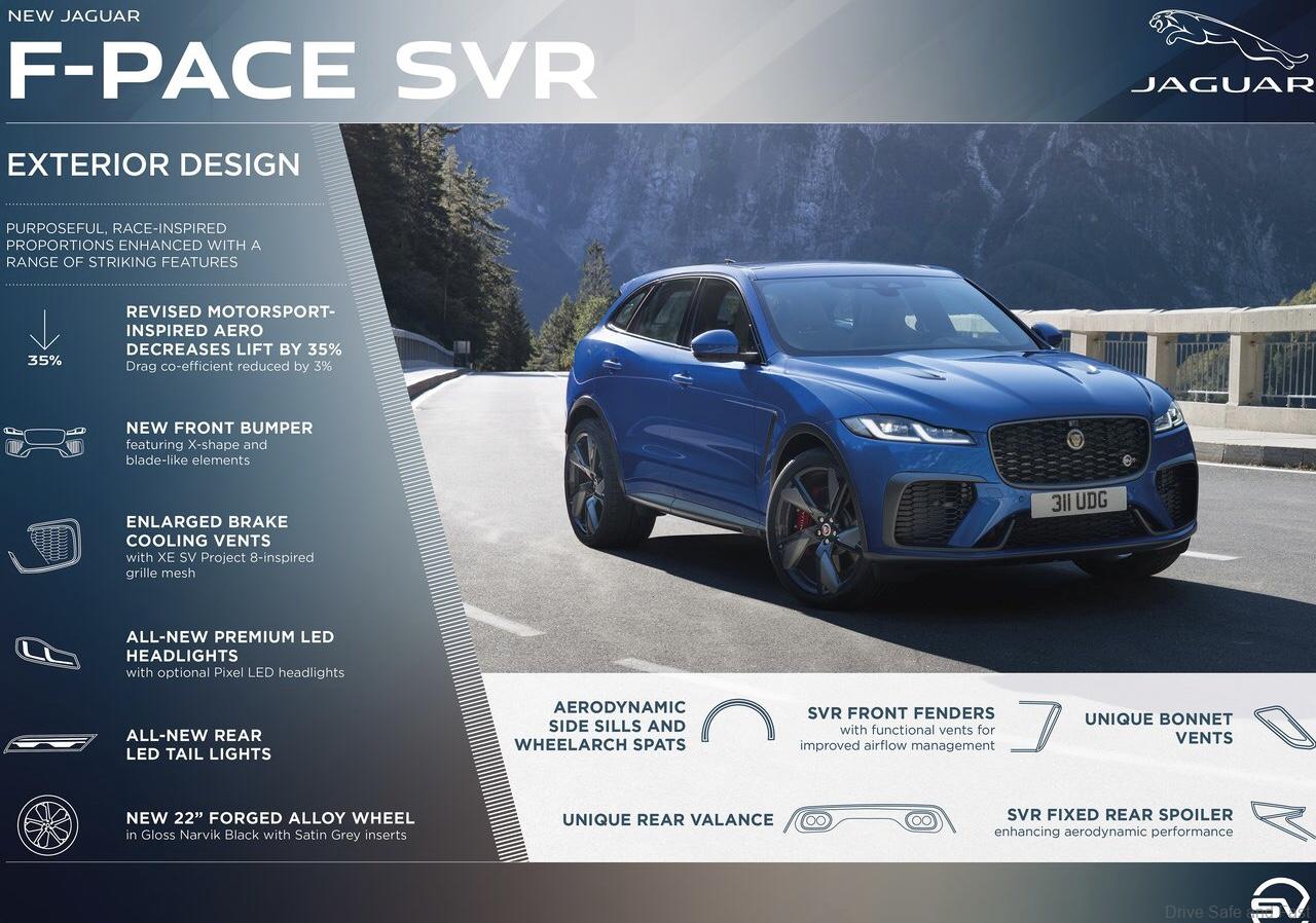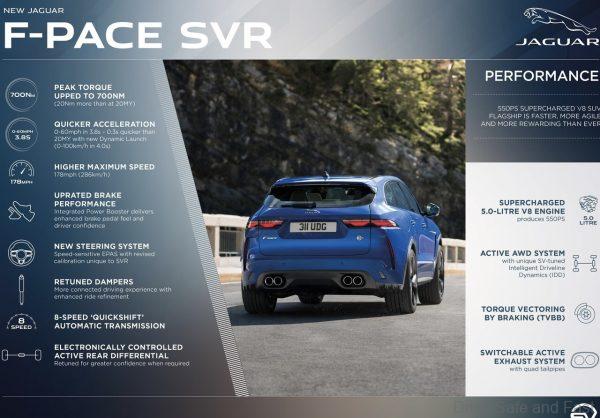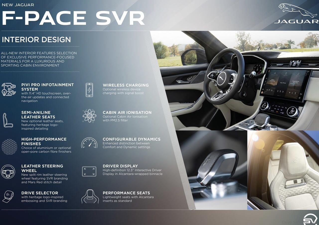 The new Jaguar F-PACE SVR is now faster, more dynamic and more refined than ever.Thanks to the latest enhancements by the Jaguar SV team, the pinnacle of the F-PACE SUV range is elevated to another level. Motorsport-inspired design details, a luxurious and performance-focused interior and the latest connected convenience technologies are among the updates delivered by a combination of new hardware and the move to advanced Electronic Vehicle Architecture (EVA 2.0).