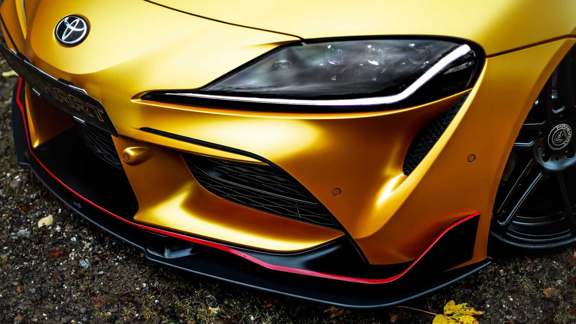 The matte foiling in MANHART-typical golden yellow, which is provided with decorative stripes in black and fine red accent lines, forms a strong contrast. For even more visual sharpness and overtaking prestige, the Supra also has a front spoiler lip by AC Schnitzer. And to top it off, last but not least – for reasons of appearance and driving dynamics – a lowering of the suspension should not be missed: The suspension upgrade was realized together with H&R.