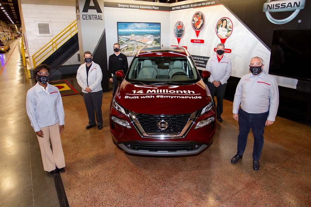 Employees completed assembly of an all-new 2021 Nissan Rogue in Scarlet Ember Tincoat at the Nissan Smyrna Vehicle Assembly Plant — the 14 millionth vehicle to roll off the lines at the automaker’s first U.S. plant. Nissan Smyrna is the highest-volume vehicle assembly plant in North America annually since 2014.