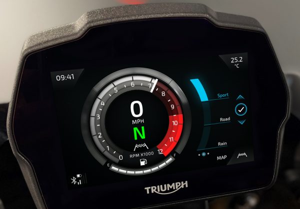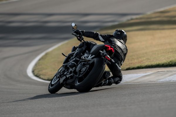 The Speed Triple 1200 RS also benefits from a host of new technologies such as five-inch TFT instruments with Triumph Connectivity System fitted as standard, Shift Assist up-and-down quickshifter, full LED lighting and a keyless system. As for electronics, there’s Optimised Cornering ABS, cruise control, switchable Optimised Cornering Traction Control (with IMU) and five riding modes, namely Rain, Road, Sport, Track and Rider.