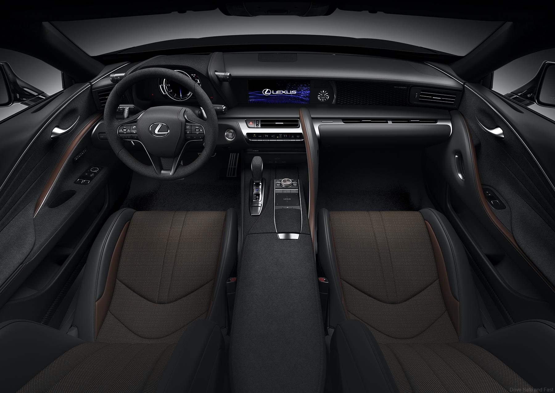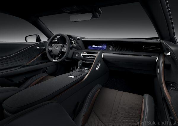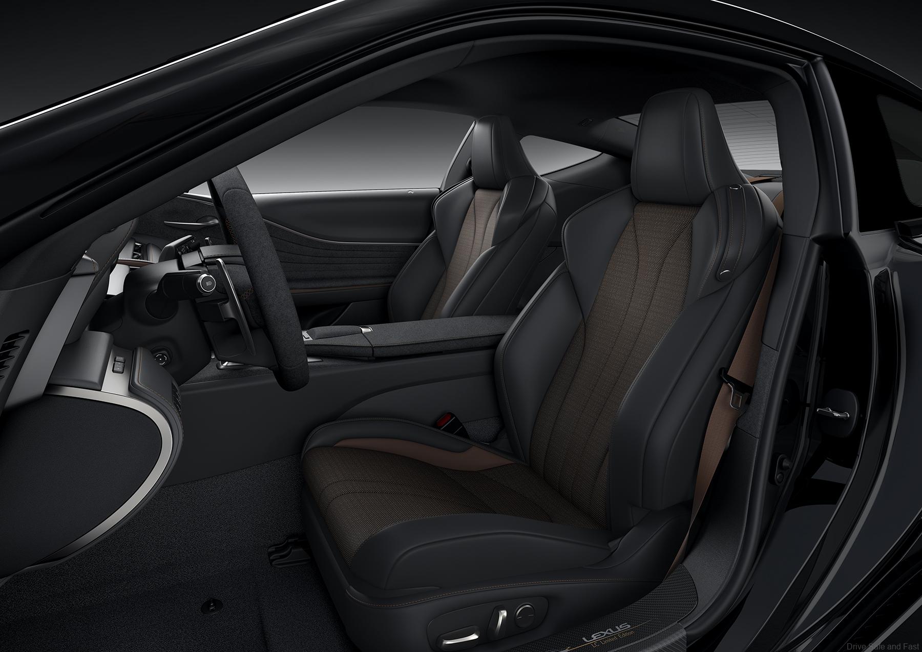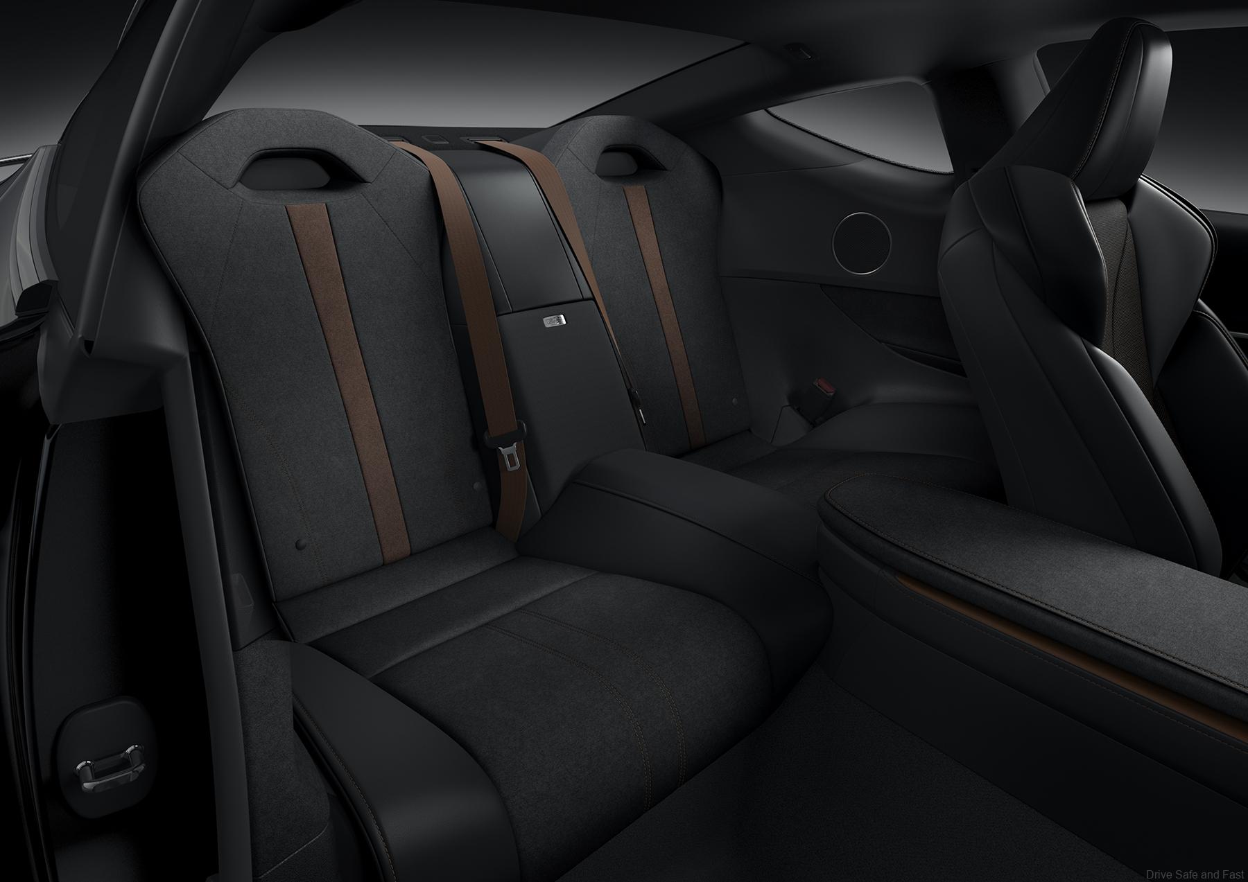 The high-capacity torque-sensing limited-slip rear differential efficiently distributes engine power to the rear axle, helping to optimize traction, handling and control in a variety of conditions. The standard Yamaha rear performance rod with damper, an available option on other LC models, provides added rigidity to the suspension package. Stepping inside, the serialized badge on the center console immediately identifies the limited nature of the vehicle and its sequence of the 100 produced. The cabin is adorned with black Alcantara-trimmed sport seats that feature elegant Saddle Tan accents and seat belts. The steering wheel and shift lever are also accented in black Alcantara trim. A carbon-fiber scuff plate accents the door, and once inside driver and passengers can bask in the sound of the standard Mark Levinson 13-speaker 915-watt Reference Surround Sound Audio system.