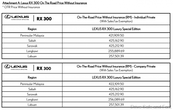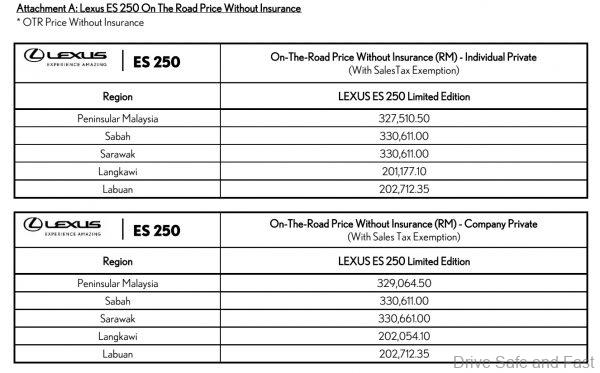 The Lexus RX 300 Luxury Special Edition is priced at RM421,909.50 on the road without insurance while the new Lexus ES 250 Limited is priced at RM320,510.50 on the road without insurance. Orders for the new Lexus