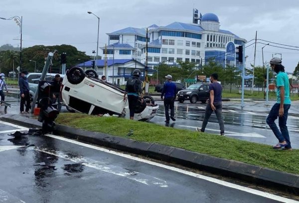 As you can see, this Perodua Viva has turned turtle presumably after losing control and coming into contact with a steel post. The real cause of the accident is unknown but it doesn’t take an expert to see that the bad combination of slick tyres (seen fitted on the rear) and wet road surface may have played a part in this tragic event.