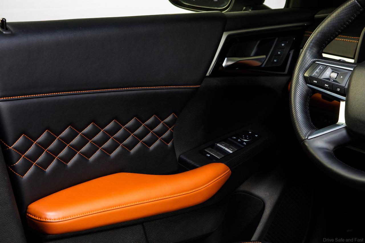 The interior features high-end materials and high-tech features. The upper part of the dashboard is covered with a soft padding wrapped in leather with stitching. The door panels feature a large area of door inserts and soft padding.