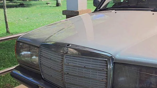 Also unfortunate was that the three-pointed star hood ornament had been vandalised or possibly removed to prevent vandalism. The rims also looks to be either aftermarket units of some sort. The car was sitting on jackstands. I suspect this reduces the need to keep the tyres inflated over the years.