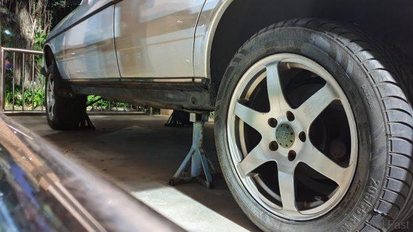 Also unfortunate was that the three-pointed star hood ornament had been vandalised or possibly removed to prevent vandalism. The rims also looks to be either aftermarket units of some sort. The car was sitting on jackstands. I suspect this reduces the need to keep the tyres inflated over the years.