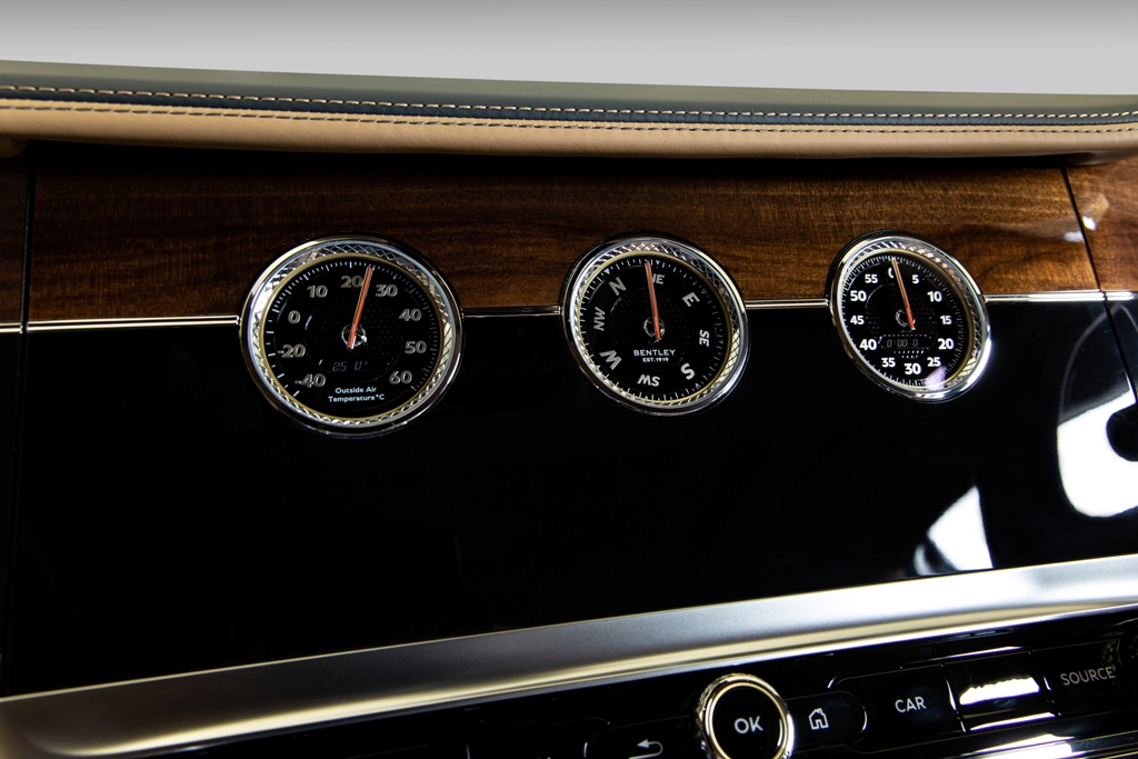The industry-first Bentley Rotating Display is also available on the new Flying Spur V8. When the engine start button is pressed, the veneer section in the middle of the dashboard rotates to reveal a 12.3-inch touchscreen, displaying three, customisable digital tiles. The second side of the display reveals three elegant analogue dials showing outside temperature, a compass and a chronometer. A complete digital detox can be selected on the third side, to simply enjoy the seamless wood veneer fascia continuing around the cabin.