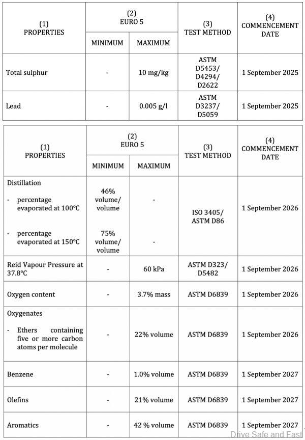 The new legislation also makes changes to petrol standards in Malaysia. These changes will not come into effect until the 1st of September 2025, with more changes coming in 2026 and 2027. Here are the new standards in full.