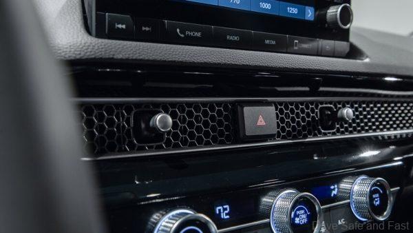 A striking metal honeycomb mesh accent stretches from door to door across the dash. It serves both form and function, creating a dramatic visual dividing line between the audio, information displays and the climate controls, while the intricate flow-through design conceals the air vents that would otherwise mar the uncluttered and harmonious look of the dash.