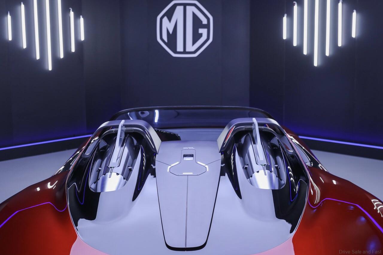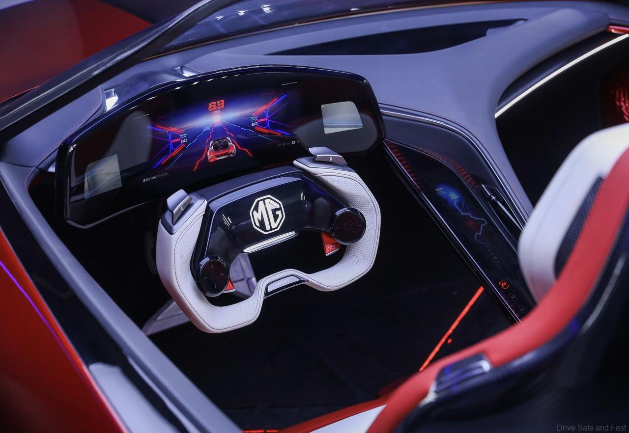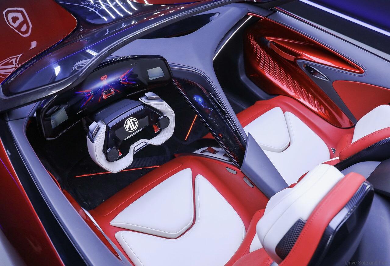 MG’s ‘Zero Gravity’ seats have floating head restraints, while the door panels and red leather handles reflect the ‘laser belt’ that runs down the car’s exterior.