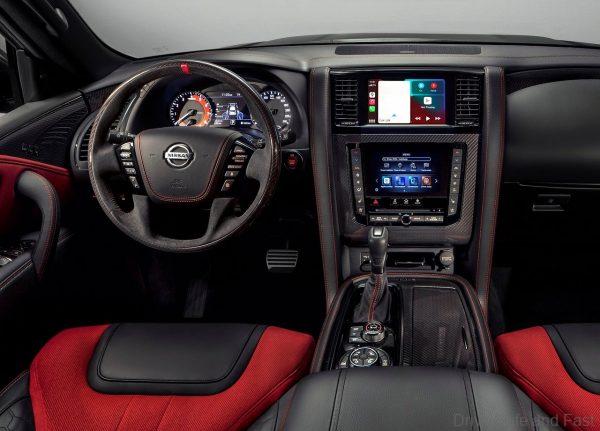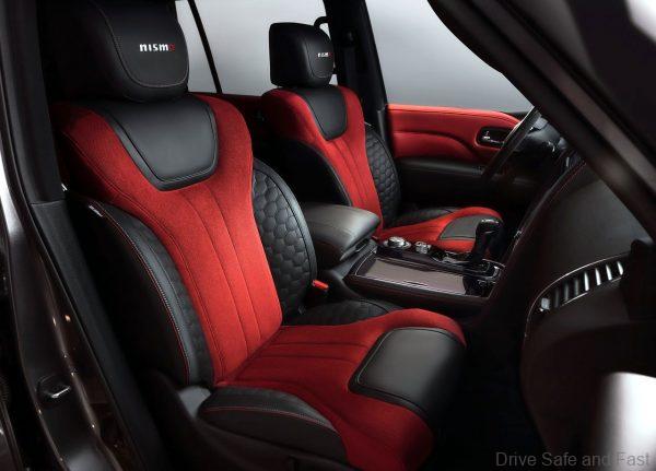 The signature NISMO red line wrap covers the circumference at the model’s base, the contour adding a boost to its definition, while the 22-inch, two-tone 2 tone aluminum wheels sport the NISMO logo to add a distinctive aesthetic. The SUV’s tuned suspension features Bilstein shock absorbers, which provide a sportier and improved handling.