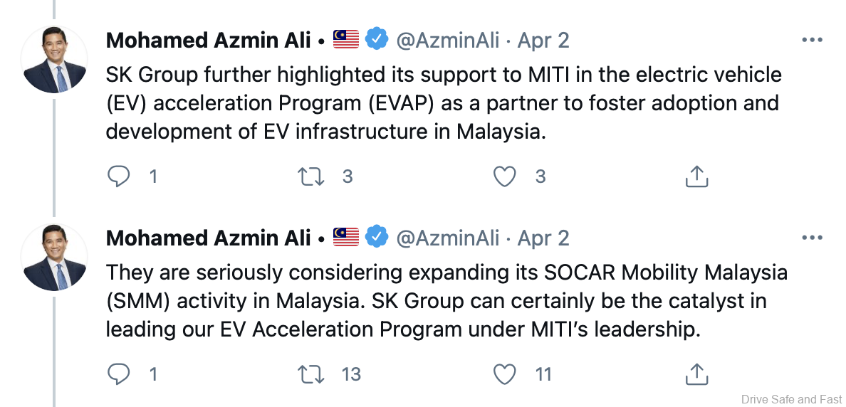Well, last week, MITI Minister Azmin Ali Tweeted that SOCAR’s parent company, SK Group were supportive of EV development in Malaysia. To that end, they would be expanding SOCAR’s activities in the country.