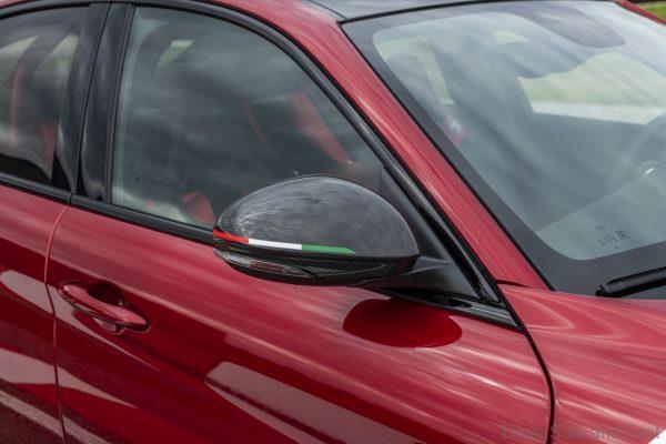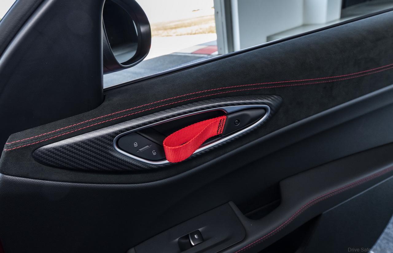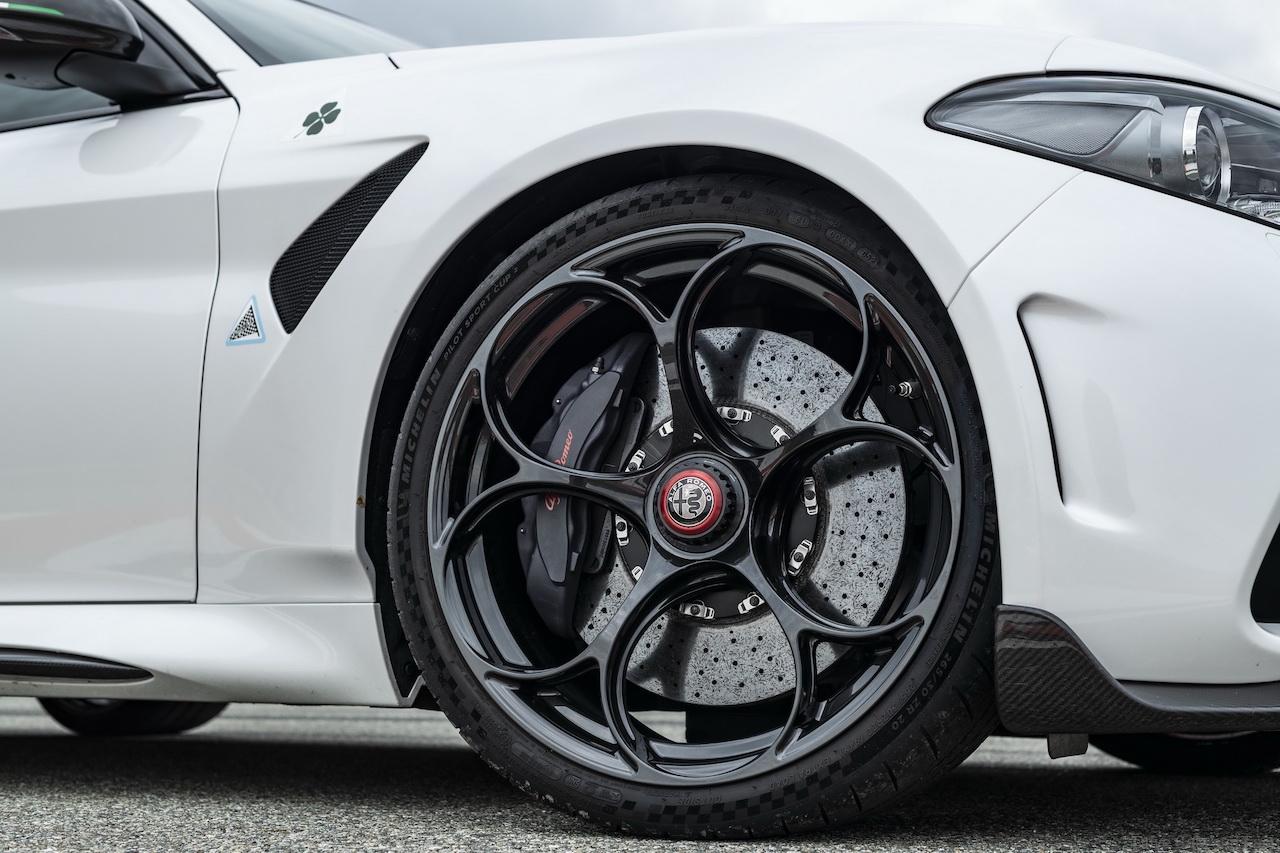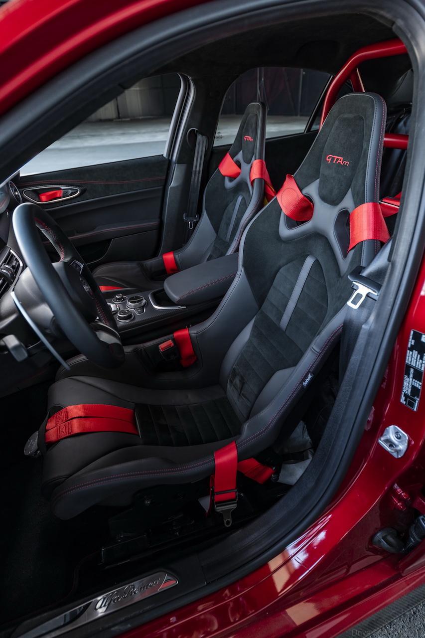 The bodywork features a powerful front that expresses all the power unleashed by the engine, with new, larger air intakes and technical elements in carbon fiber, giving a specific and precise role and position to the aesthetics. Even the iconic “Trilobo” is made extreme without leaving behind its DNA; reminiscent of the early days of F1 are the slots that edge the badge, aimed at optimizing cooling, which have also become typical Alfa Romeo features. In the lower part, the active splitter has been redesigned. Once only found on the Giulia Quadrifoglio, it has now been made even larger on the GTAm, and can now be adjusted lengthways by 40 mm to ensure a perfect balance with the rear. In the rear, especially on the GTAm, pride of place goes to the large spoiler. With its aerodynamic profile and 4-position adjustment (low-high drag) of the central section, the car is also perfectly aerodynamically balanced here. On the sides, the carbon fiber side skirts, broadened front fender and the clearly visible carbon fiber on the rear wheel arches accentuate the car’s “size impression”, with an image of power and dynamism. The new 20-inch rims with single locking nuts have been specially designed to best combine style and lightness, therefore ensuring the best possible overall handling of the car. A typical solution among F1 single-seaters, it is unique in the road-going sedans on the market.