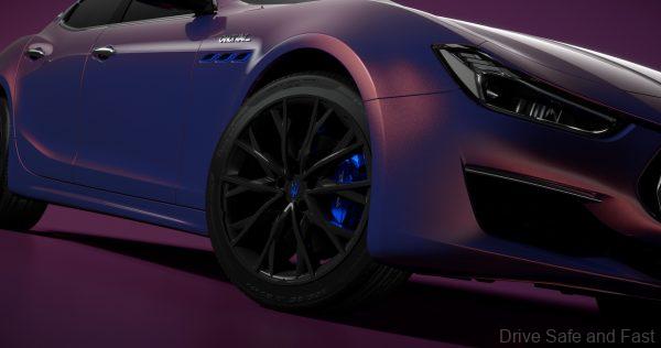 The Ghibli Hybrid Love Audacious gets 20″ Teseo wheels in Dark Miron, some customised badges from CANOTWAIT_ and Digital Aurora purple exterior paint finish.