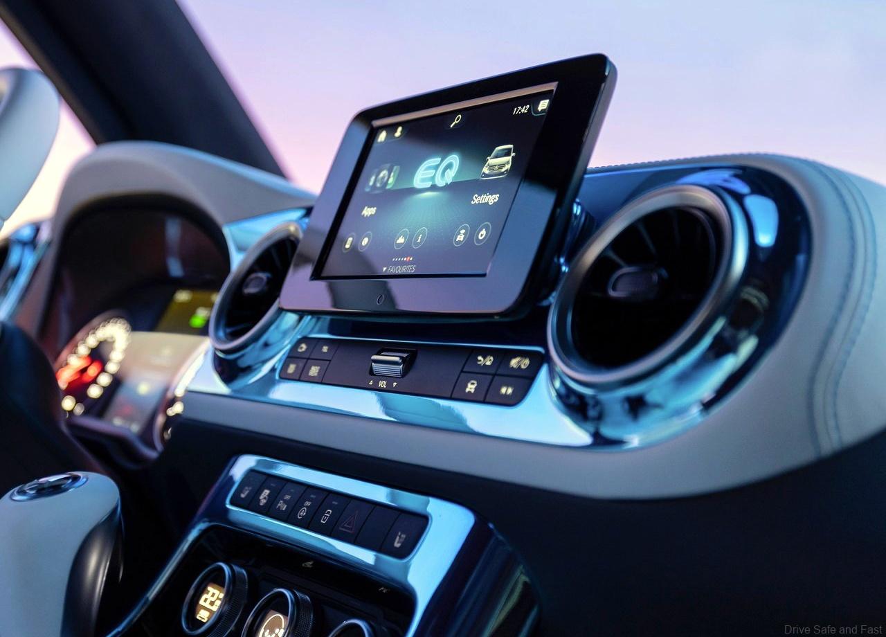 Inside, the Concept EQT is upholstered in white nappa leather, with plaited leather applications on the seat centre panel made of recycled leather. There are a few stowage compartments in interesting places, galvanised trim pieces and a multifunction steering wheel with capacity buttons. Ambient lighting is also a big part of the interior design.