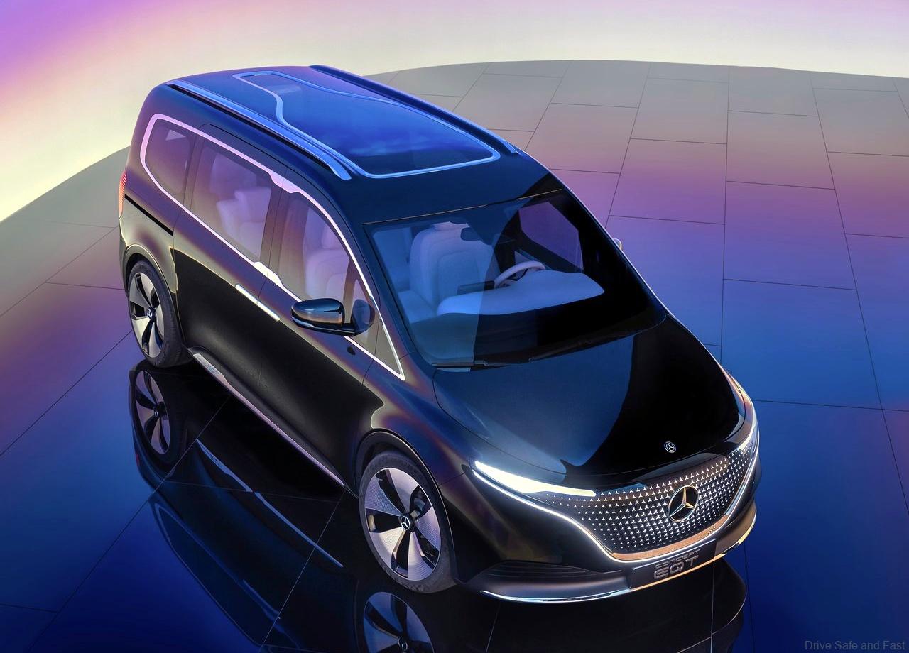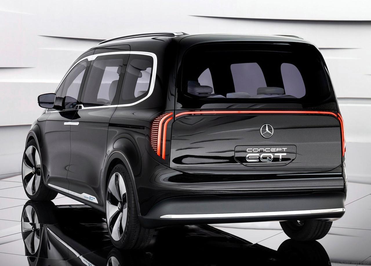 The Concept EQT (length/width/height: 4,945/1,863/1,826 millimetres) features sliding doors on both sides with a particularly large opening so that both full-sized individual seats in the third row can be reached without difficulty. Three child seats can be fitted next to each other in the second row of seats. A panoramic roof with a starscape lasered into it floods the interior with light. The vehicle’s elegant bottle design which tapers from the front to the rear makes the vehicle appear longer. The steeply sloping rear with a comfortable, vertical tailgate and window provides for a particularly spacious load compartment. If more space is required, the third-row seats can be folded or removed completely, leaving sufficient space for a pram, a transport box for dogs and other leisure equipment.