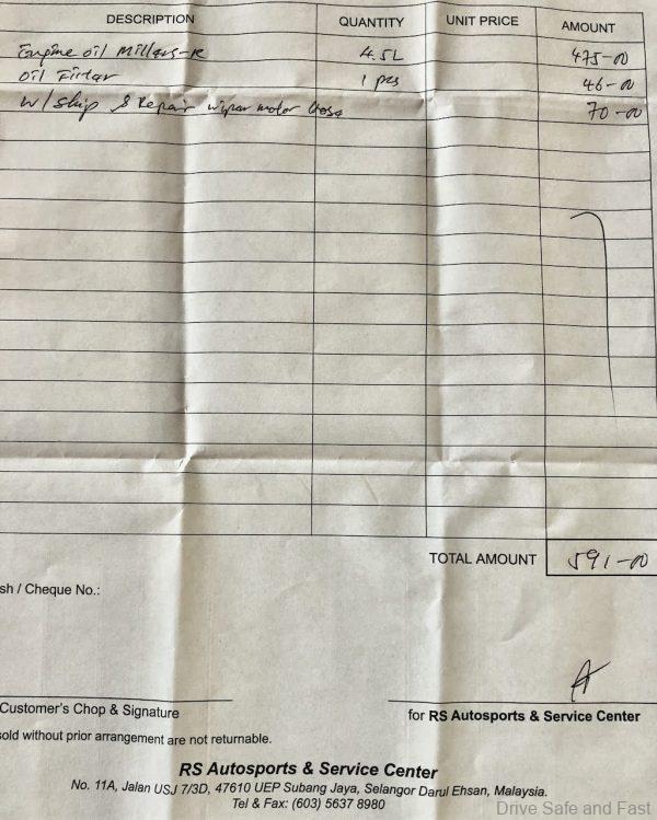 Our bill for this visit was just RM591.00 for high quality Millers lubricant, original oil filter and this included fixing our windshield washer motor. It took about two hours and we are totally satisfied and happy to pay this bill.