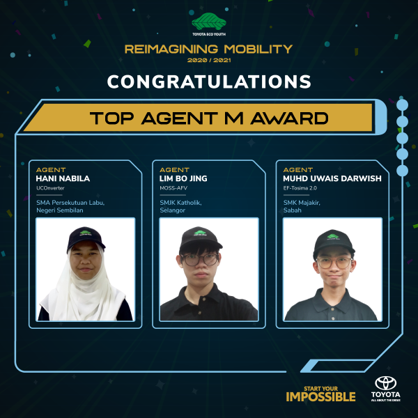 SMK Saujana Utama, Selangor won the Best Community Engagement and teacher, Ms. Noor Liyana Shamsudin from Maktab Tentera Diraja was nominated as the Most Supportive Teacher. Three students were selected as the Top Agent M. They are Hani Nabila from SMAP Labu, Negeri Sembilan; \ Lim Bo Jing from SMJK Katholik, Selangor and Muhammad Uwais Darwis from SMK Majakir, Sabah.