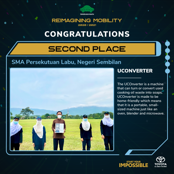 Following the final judging phase after each of the 10 finalists made their respective ‘pitches’ with live presentations on May 29, 2021, the winning teams were chosen. They are, in first place, Maktab Tentera Diraja, Kuala Lumpur (We-Sea-It Smart Tool); second place, SMAP Labu, Negeri Sembilan (UCOnverter Smart Tool); third place, SMK Kubang Kerian, Kelantan (Recybin App); fourth place, SMK Chung Hua, Sarawak (Recyclo Smart Tools), and in fifth place, SMJK Katholik, Selangor (MOSS AFV Smart Tools).