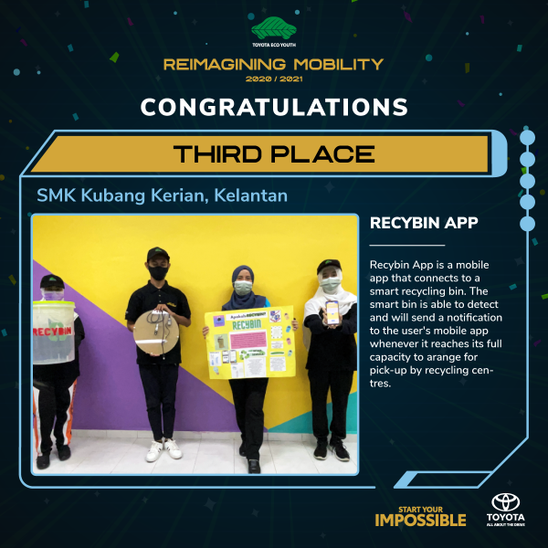 - 3rd place: SMK Kubang Kerian, Kelantan (Recybin App) – RM10,000