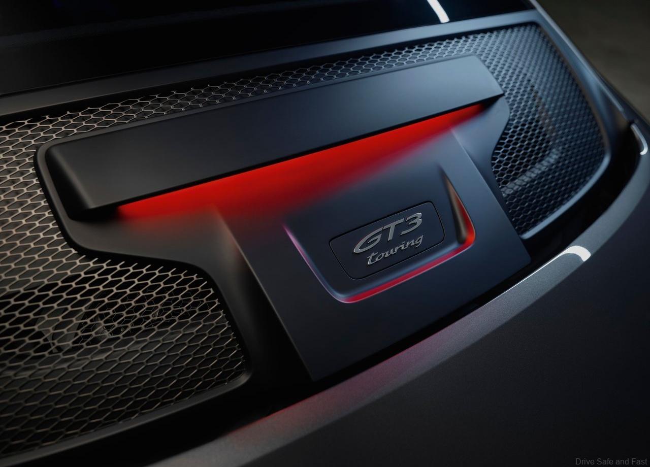 The most obvious difference is the omission of the fixed rear wing of the 911 GT3. Instead, an automatically extending rear spoiler generates downforce at high speeds while maintaining an understated appearance. A bespoke grille unique to the package compliments the understated appearance. Silver trim strips made of high-gloss anodized aluminum on the side windows are another distinguishing feature. The front fascia is painted completely in the exterior color as compared to the black lower section of the standard GT3. The interior, which is unique to the GT3 with Touring Package, includes extended leather upholstery in black is particularly elegant. The front of the dashboard and the upper side sections of the door trim panels have special surface embossing.