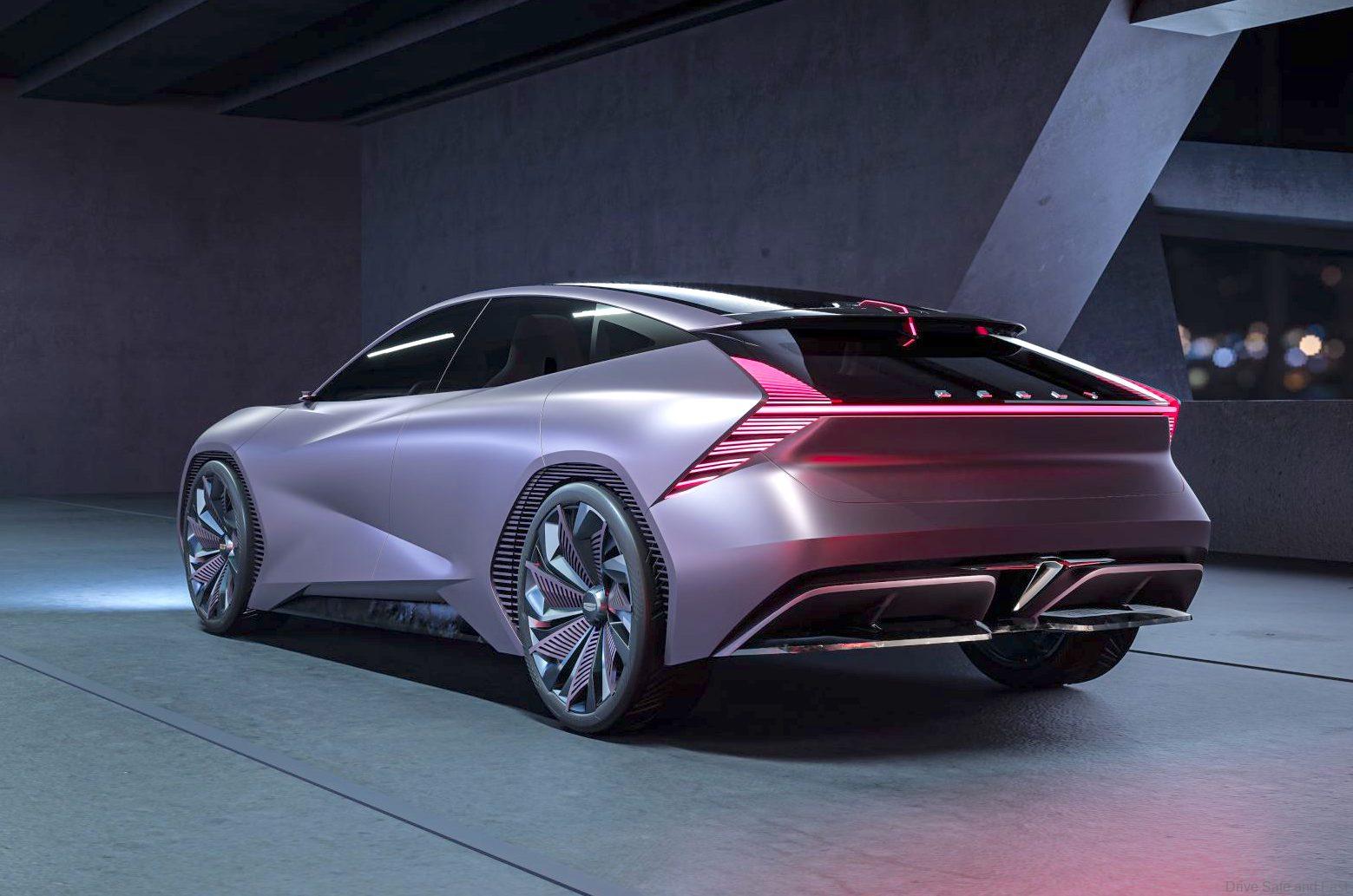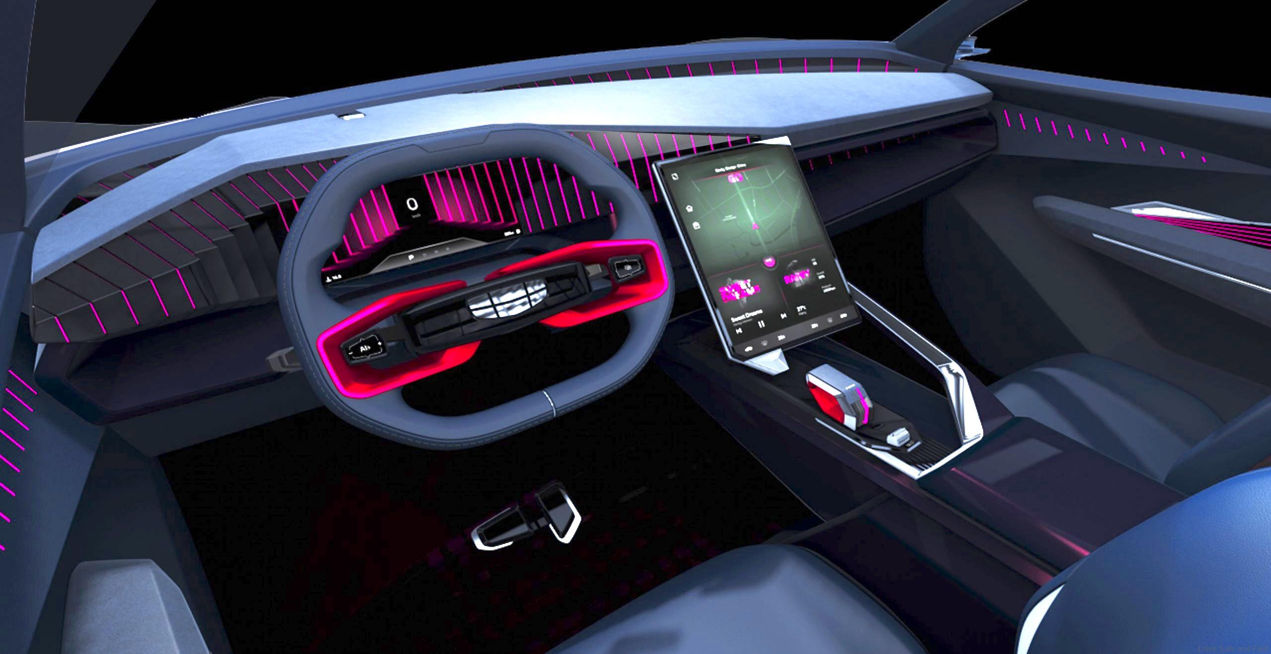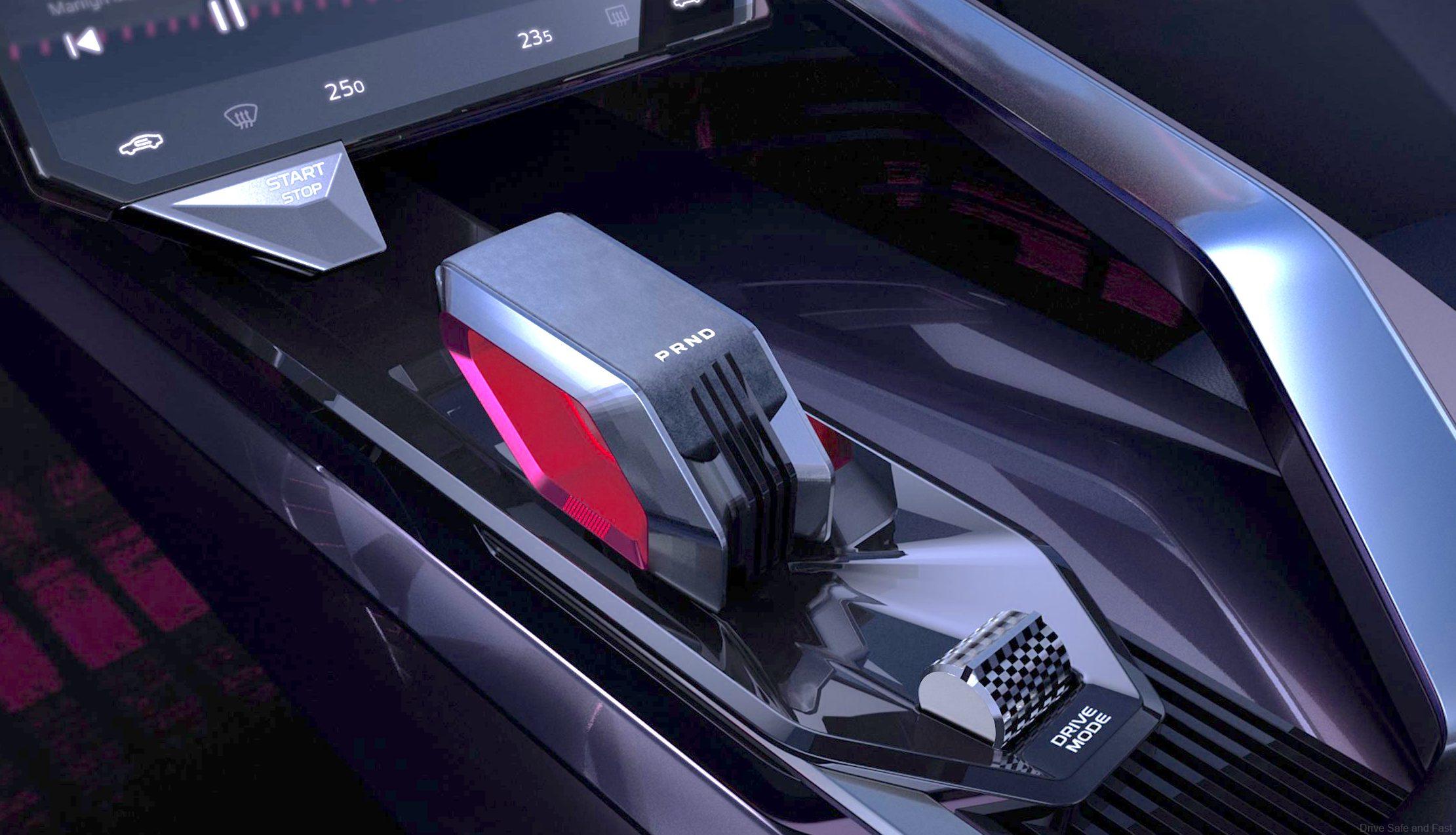 Turning inside, the interior door panels are also designed to match the characteristics of the exterior. “Cosmic Ray” light strips help to unify interior and exterior design. On top of the floating centre console, the shifter takes on an aerodynamic geometric shape that’s hollow. Four lines of light illuminate to display different gear settings.