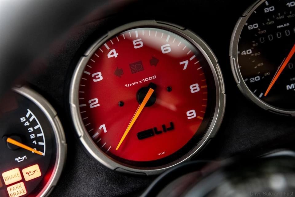 The contrasting elements include twin racing stripes on the bonnet and ducktail spoiler in grey with red borders as well as a large red finished X-brace over the engine cover. There’s also “PORSCHE” script in red across the side and on the boot. Just below the X-brace is a little badge stating the car was built for Joe Rogan.