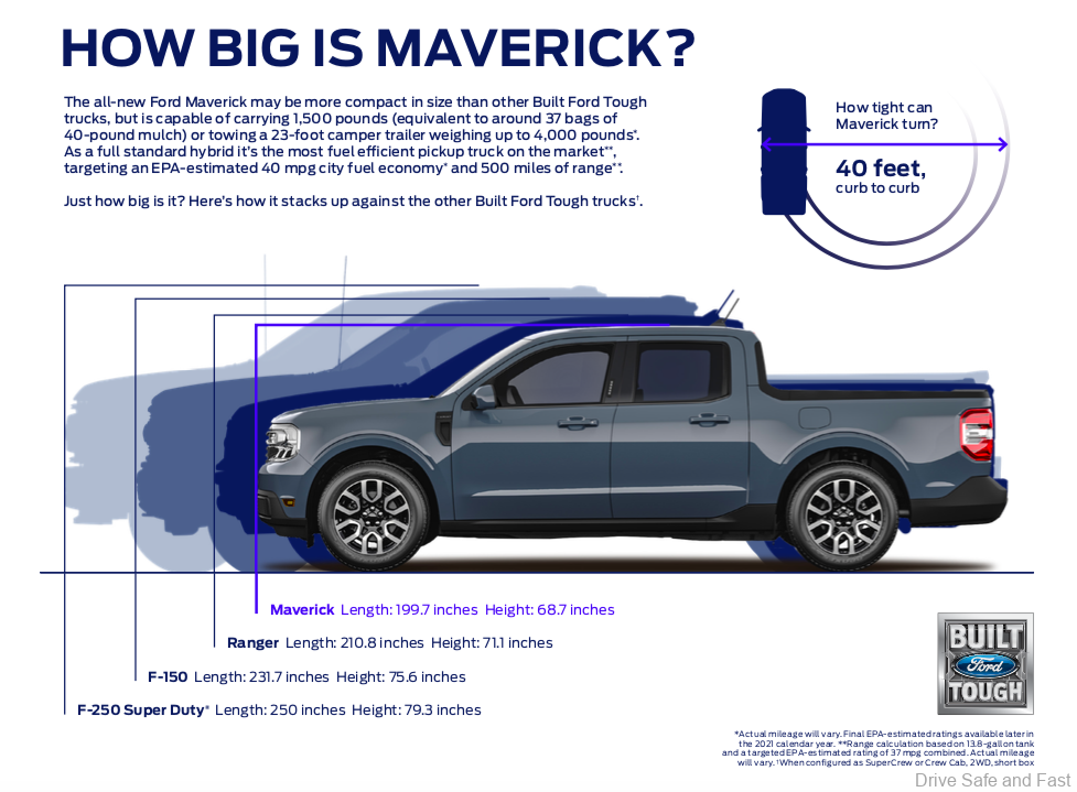 The Ford Maverick is 68.7 inches tall versus 75.6 inches for the popular and very large Ford F-150 pickup truck (pictured below).