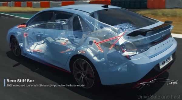 Elantra N applies four-point strut rings and rear stiff bars to strengthen body rigidity. Torque feedback R-MDPS is applied to provide a consistent steering feel even when the external environment changes, such as temperature.
