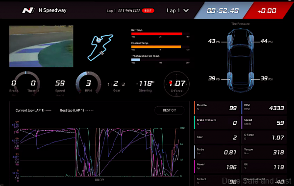 Information needed for high-performance circuit driving, such as oil and coolant temperatures, torque and turbo pressure, which are difficult to check in most cars, is displayed in numbers on the cluster so that the driver can feel more engaged with Elantra N’s performance.