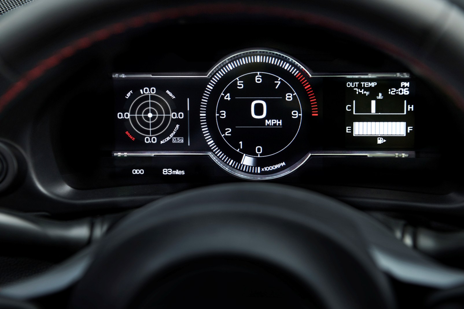 Flanking the tachometer on the left, a programmable meter can display amps, coolant temperature or Lateral-G. When Track Mode is selected, the tachometer switches from a traditional circular form to a linear graph with color display.