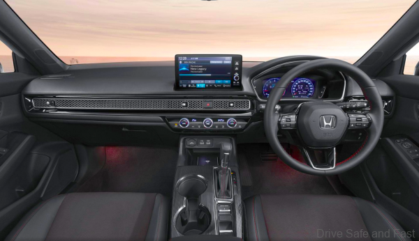 There are two variants on offer in Thailand. The more expensive Civic RS gets full LED headlamps, black Ultrasuede upholstery, auto wipers, ambient lighting, dual-zone climate control, 9-inch touchscreen infotainment that supports Apple CarPlay/Android Auto, Bluetooth, voice command, navigation, Honda Connect with an 8-speaker system, plus you get alloy pedals, auto dimming IRVM and paddle shifters.