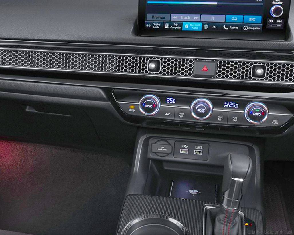 There are two variants on offer in Thailand. The more expensive Civic RS gets full LED headlamps, black Ultrasuede upholstery, auto wipers, ambient lighting, dual-zone climate control, 9-inch touchscreen infotainment that supports Apple CarPlay/Android Auto, Bluetooth, voice command, navigation, Honda Connect with an 8-speaker system, plus you get alloy pedals, auto dimming IRVM and paddle shifters.