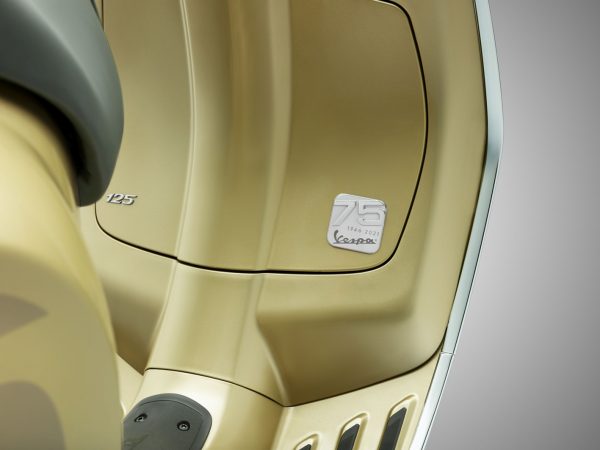 The side panels and front mudguard display the number 75 in a slightly stronger shade, creating a quietly elegant tone-on-tone effect, which is repeated on the front of the scooter, where the traditional “tie” is an opaque pyrite yellow.