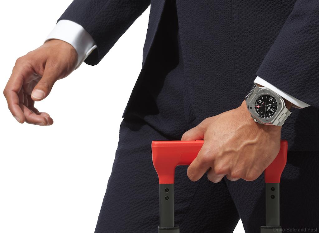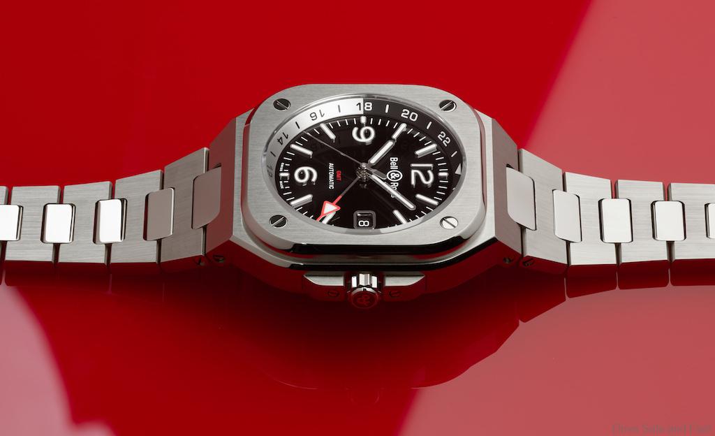 Press Release: The BR 05 GMT is a combination of stainless and robust materials encasing the finest Swiss watchmaking mechanics. Equipped with an automatic caliber with GMT function, wound by a 360° oscillating weight, the new model reveals the beating heart of its movement through a sapphire glass case back.