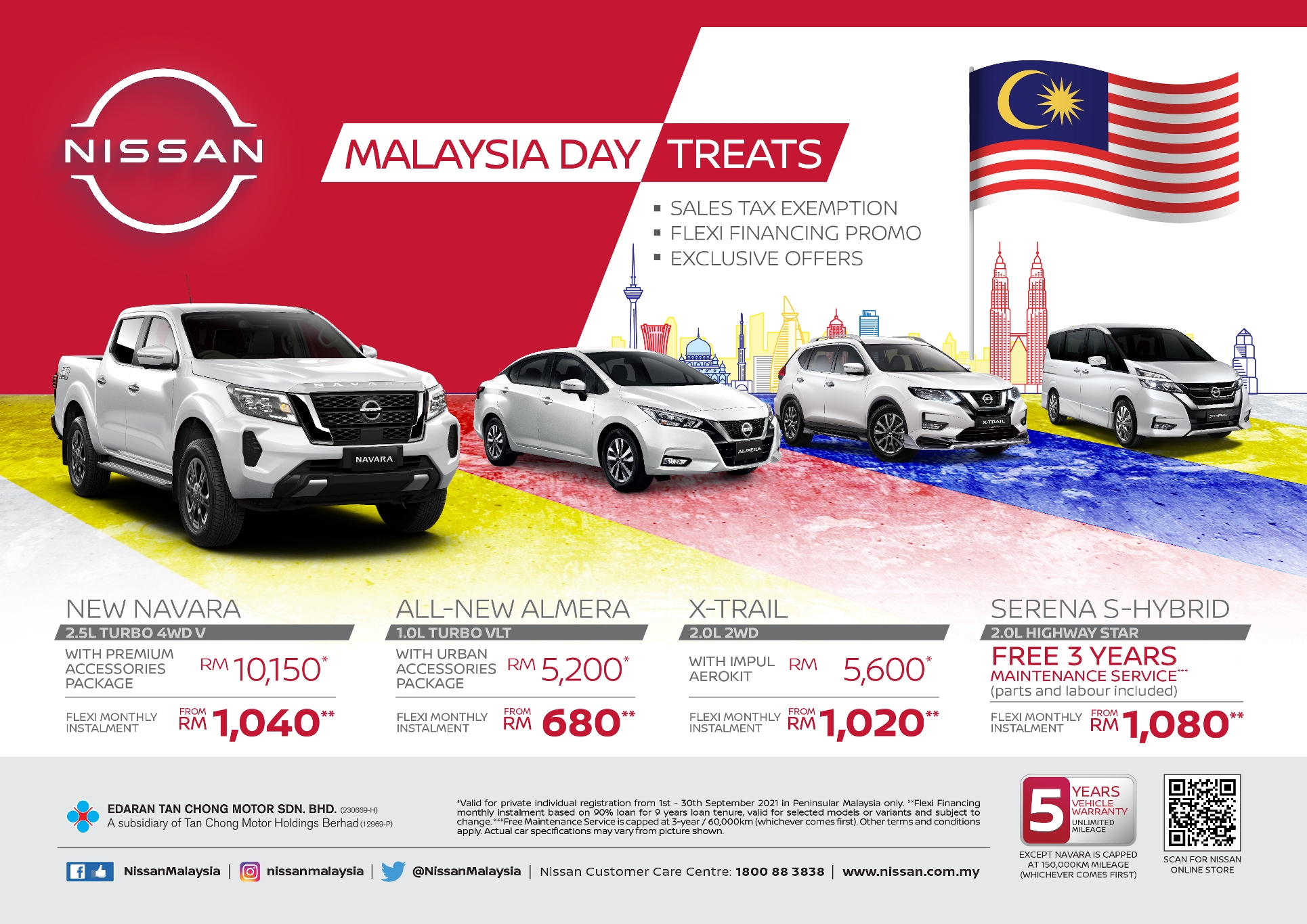 The campaign, which runs until 30 September 2021, offers sales tax exemption, attractive low monthly instalment (Flexi Financing promotion), exclusive accessories package and maintenance package with every purchase of Nissan selected models.