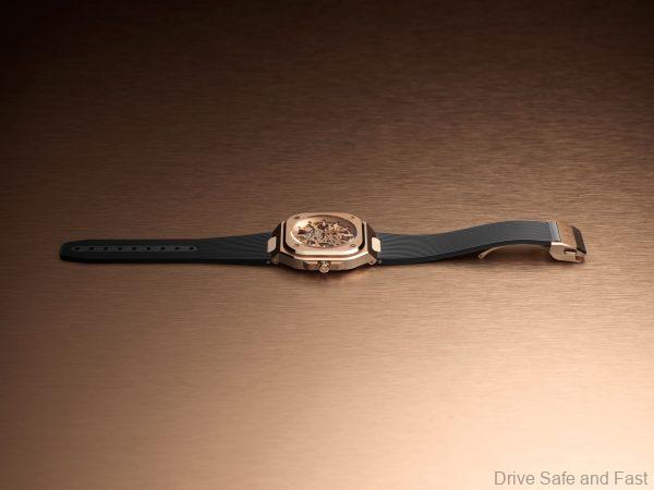 The BR05 SKELETON GOLD is equipped with a BR-CAL.322 mechanism, wound by a 360° 18 ct rose gold-plated oscillating weight, open-worked to showcase the movement designed by Bell & Ross with a 38-hour power reserve. The brand’s logo is metallized on the sapphire case-back.