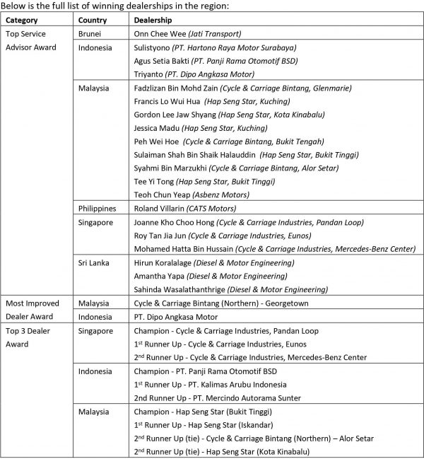 A total of 32 awards were presented across three categories. The highlight of the evening were the recipients of the Mercedes-Benz Top 3 Dealer award, namely Cycle & Carriage Industries, Pandan Loop from Singapore, PT. Panji Rama Otomotif BSD from Indonesia and Hap Seng Star Bukit Tinggi from Malaysia. These dealerships excelled across all the touchpoints to achieve the highest overall score in service excellence and customer satisfaction in the region.